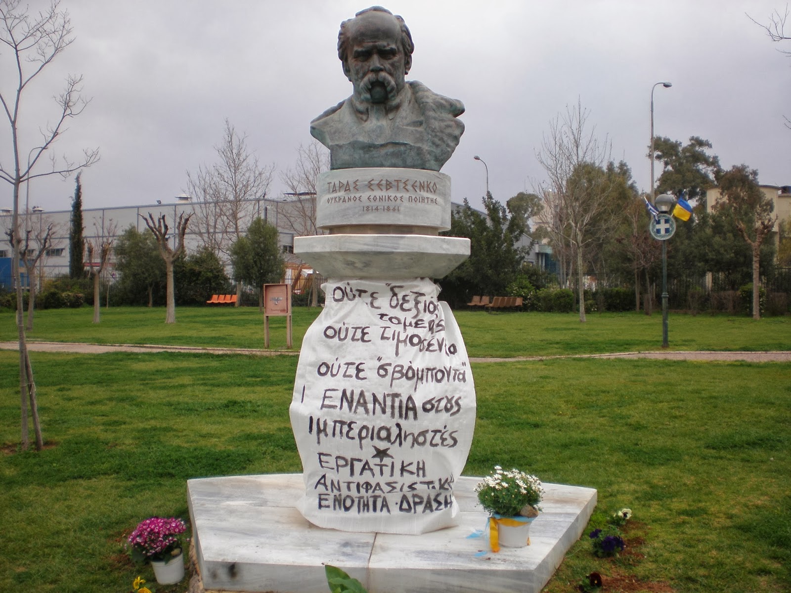 Στις 9/3/2014 πετάχτηκαν τρικάκια και κρεμάστηκε πανό στο άγαλμα του ουκρανού εθνικού ποιητή Τάρας Σεβτσένκο στο πάρκο Γουδί, σε προγραμματισμένη εκδήλωση του ουκρανικού προξενείου.