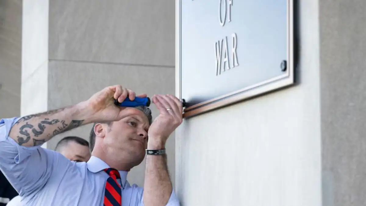 Κάτι μας είπε ο υπουργός Άμυνας (λάθος… πολέμου) των ΗΠΑ, Πιτ Χέγκσεθ, ο οποίος σε μια συμβολική κίνησή του βίδωσε μια ταμπέλα και βάφτισε το υπουργείο του σε υπουργείο Πολέμου…