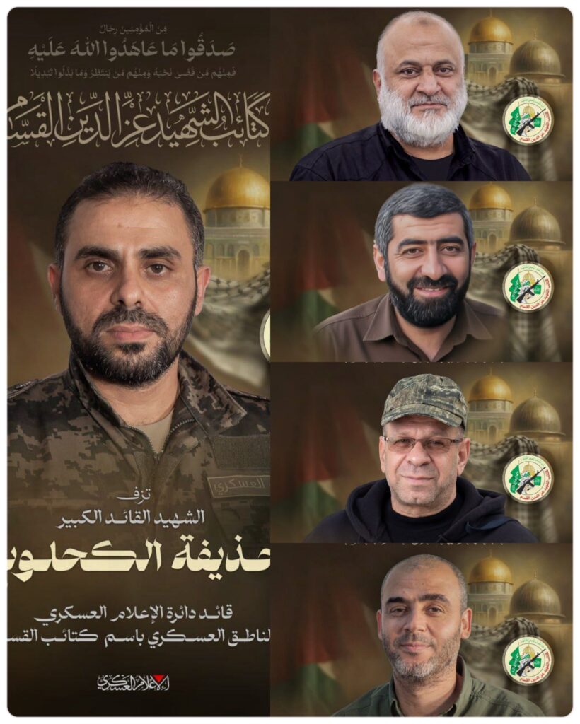 Σήμερα σας ανακοινώνουμε με κάθε υπερηφάνεια και τιμή, έναν μεγάλο αστερισμό του λαού μας και των ηρωικών μουτζαχεντίν που έδωσαν τη ζωή τους αφού η κατοχή παραβίασε την εκεχειρία και επανέλαβε τον εγκληματικό της πόλεμο τον περασμένο Μάρτιο, για να ενταχθούν σε ένα μακρύ καραβάνι δίκαιων μαρτύρων. Εδώ αναφέρουμε συγκεκριμένα μια ομάδα των ευλογημένων ηγετών του Κασάμ, οι οποίοι έπεσαν στο πεδίο της μάχης και στα δωμάτια διοίκησης και ελέγχου, ενώ βρίσκονταν στην πρώτη γραμμή, εκτελώντας τους τζιχαντιστικούς τους ρόλους χωρίς κούραση ή πλήξη.